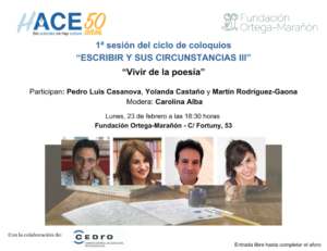 El pasado lunes 23 de febrero comenzó la tercera edición del ciclo ‘Escribir y sus circunstancias’, organizado por ACE, con patrocinio de CEDRO, con el siguiente reclamo: «Vivir de la poesía». Moderados por Carolina Alba, directora de La estación azul, participaron tres poetas y conocedores de las voces actuales: Pedro Luis Casanova, Yolanda Castaño y Martín Rodríguez Gaona.